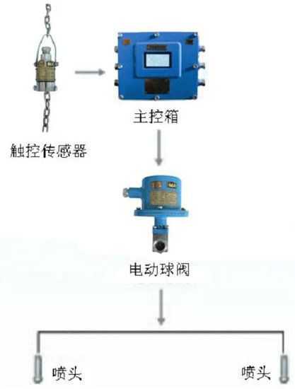當(dāng)皮帶運輸機輸煤時,煤流觸動傳感器探桿,觸控傳感器接收到信號觸發(fā)主控箱控制電路,打開電動球閥,裝置自動灑水降塵,無物料時延時一段時間后停止噴霧(延時可調(diào))。